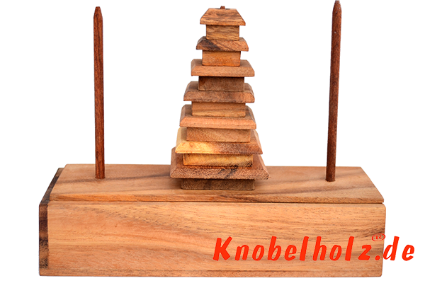 Der Turm von Hanoi kann aus drei bis sieben Scheiben bestehen. Der gesamte Turm soll, mit den verschiedenen Scheibengrössen, vom Mittelpfosten zum rechten oder linken Pfosten umgestapelt werden. Der jeweilige dritte Pfosten rechts oder links ist der Hilfsplatz (Ausweichplatz),notwendig um die nicht benötigte Scheibe zu parken, damit die Scheiben der richtigen Reihenfolge aufgestapelt werden können. Es kann nur die oberste Scheibe vom einem Turm bewegt werden. Es kann nie eine grössere Scheibe auf eine kleinere Scheibe gelegt werden, sondern immer kleine Scheiben auf große Scheiben.