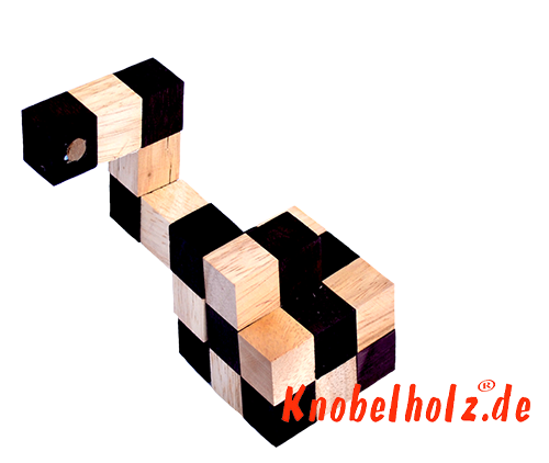 Der Schlangenwürfel besteht aus einer Kette mit 27 Holzwürfeln aus Samanea Holz. Die Würfel werden durch ein in der Mitte verlaufendes Gummiband miteinander verbunden. Sie bilden verschiedene Zweier- oder Dreiergruppen in einerspeziellen Anordnung, die das Foto oben zeigt. Ziel des Puzzles ist es, die Würfelkette so zu legen, dass ein 3x3x3-Würfel entsteht. Hast Du die beiden Fotos mit Deinem Snake Cube nach machen können dann gehts weiter mit den nächsten 2 Photos der Anleitung zum Snake Cube der Level Box.