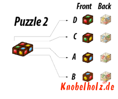 Durch die farblich unterschiedlichen Würfel, in der Anordnung der Farben sind auch noch zwei weitere Puzzle möglich und auch sehr schwer. Im Puzzle 2 müssen die Würfel so angeordnet werden das pro Seite ebenfalls keine Farbe doppelt vorkommt, also jede Seite ebenfalls unterschiedliche Farben zeigt. Aber jetzt werden die Würfel nicht mehr hintereinander gelegt sonder als Quadrat zusammen. Oben, auf den 4 Holzwürfeln, 4 unterschiedliche Farben und an den 4 Seiten dürfen ebenfalls nur unterschiedliche Farben zu sehen sein. Das ist sehr schwer da wir sehr viele gelbe Punkte an den Würfeln vorfinden, die versteckt werden müssen. Dieses Puzzle kann man auf dem Tisch oder einer Fläche spielen. Hier die Lösung des Puzzle 2 auf der linken Seite zu sehen:
