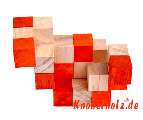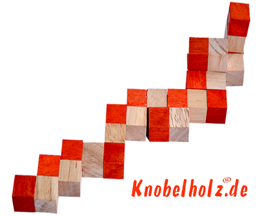 The snake cube consists of a chain with 27 wooden cubes made of Samanea wood. The cubes are connected by a rubber band running in the middle. They form different two or three groups in a special arrangement showing the photo above. The objective of the puzzle is to place the cube chain so that a 3x3x3 cube is created. If you have the two photos with your Snake Cube after make can then continue with the next 2 photos of the instructions to the Snake Cube of the level box.